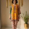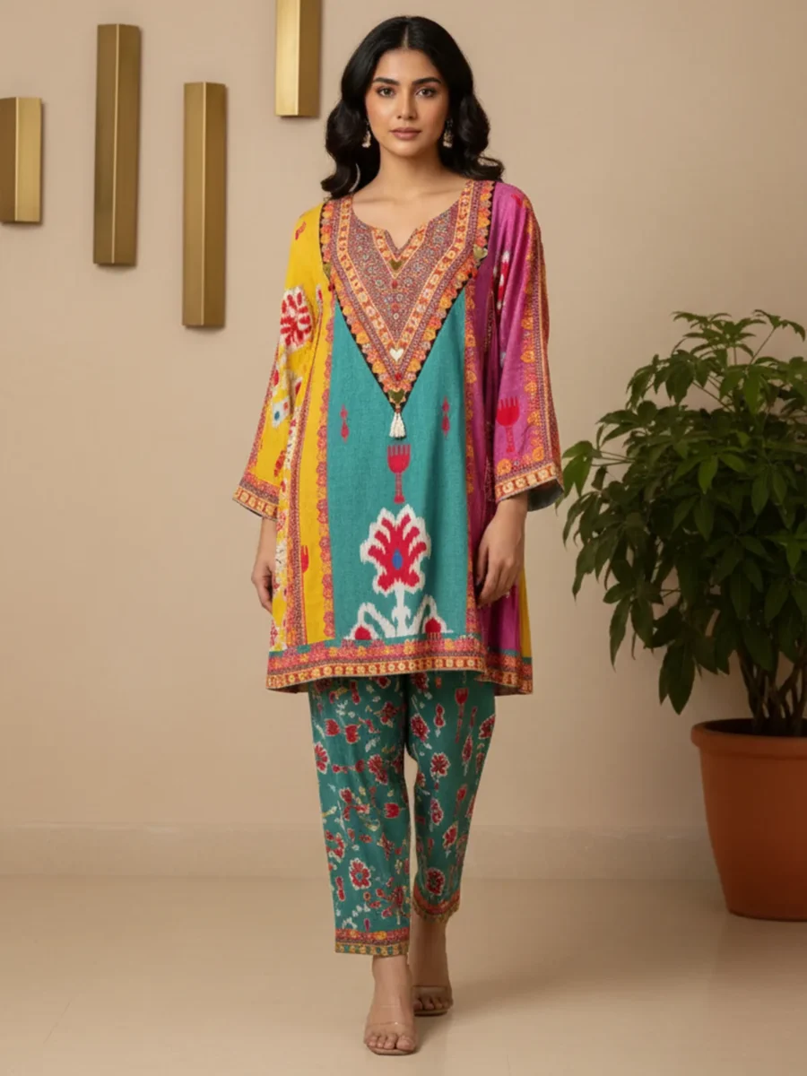 A boho-chic ethnic co-ord set showcasing bold colour-blocking Ikat prints, perfectly paired with a comfortable salwar for an effortlessly statement-making look.