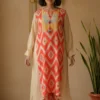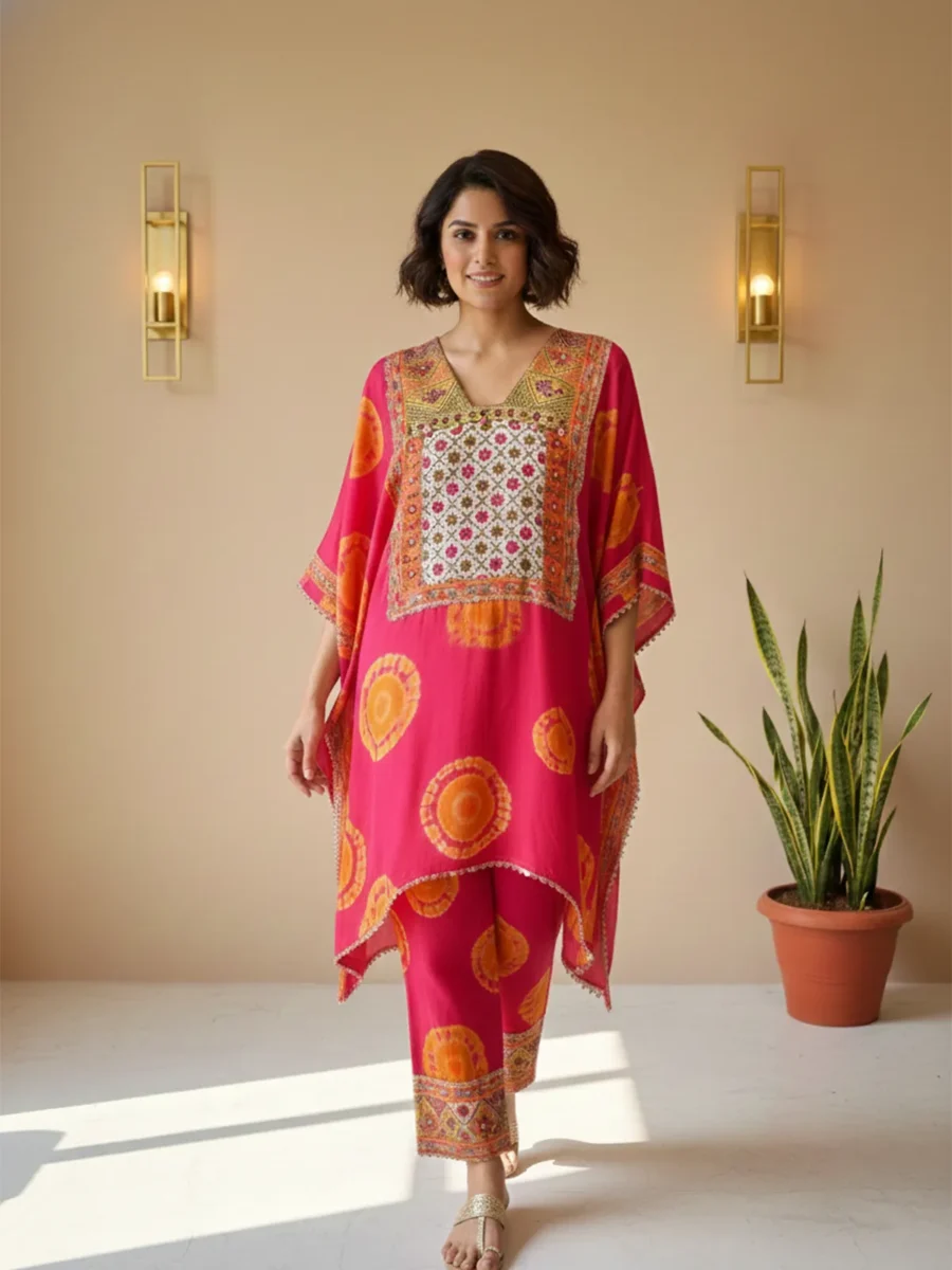 A kaftan-style, mid-length co-ord set with a high-low asymmetrical hemline, paired with straight pants for an effortlessly modern silhouette.