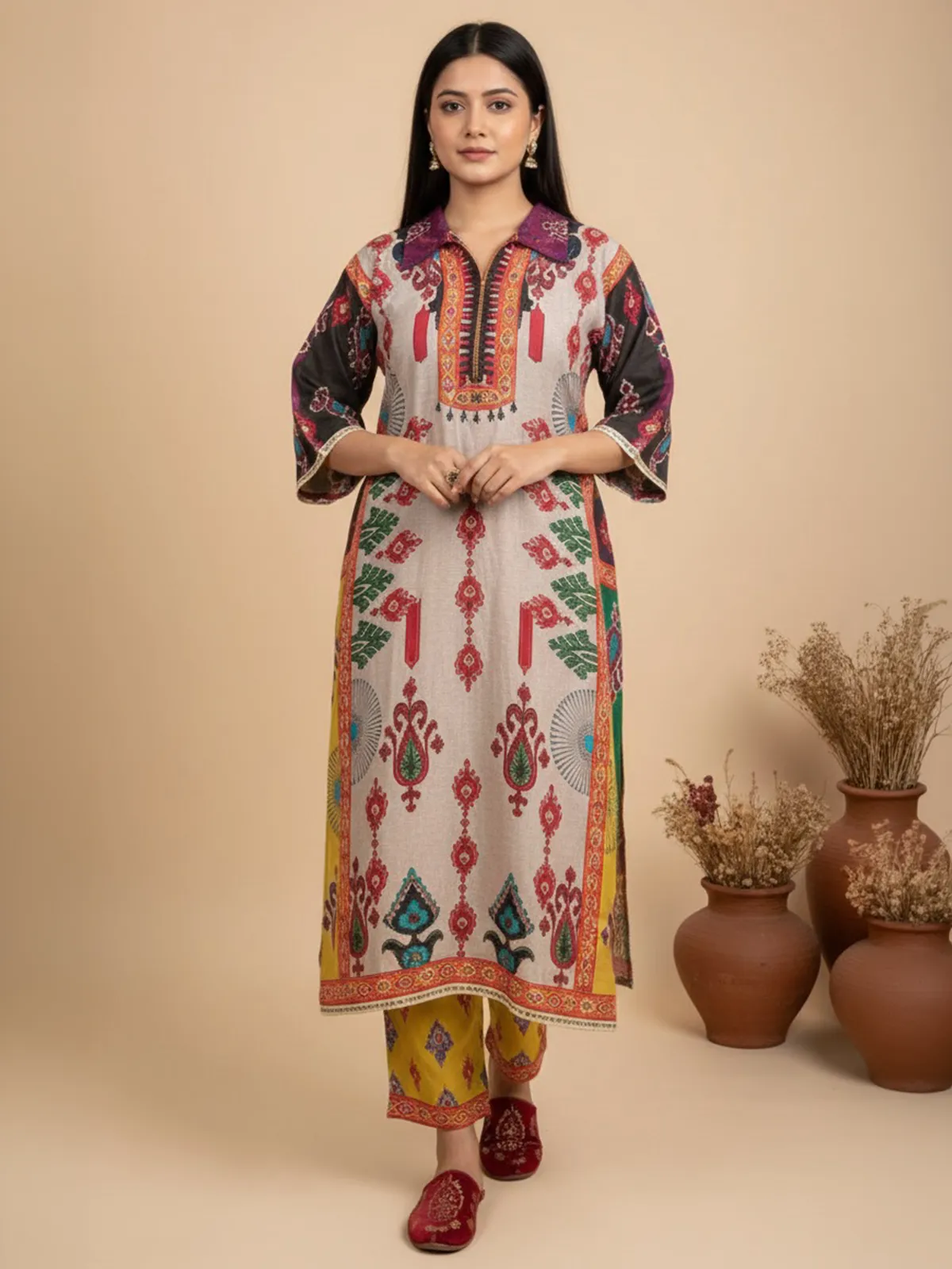 An ethnic straight-cut tunic with a distinct collared neckline, central zip detail, and 3/4th flared sleeves, paired with pants for a polished contemporary look.