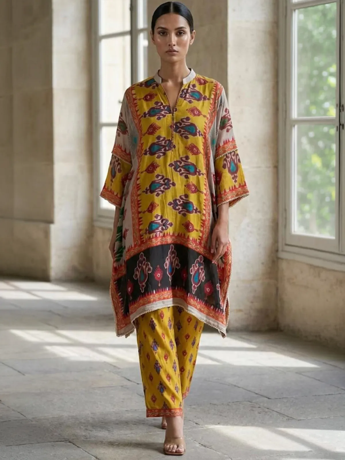 A kaftan-style, mid-length co-ord set featuring a deep V-neckline and 3/4th sleeves, paired with straight pants for an elegant, contemporary ethnic look.