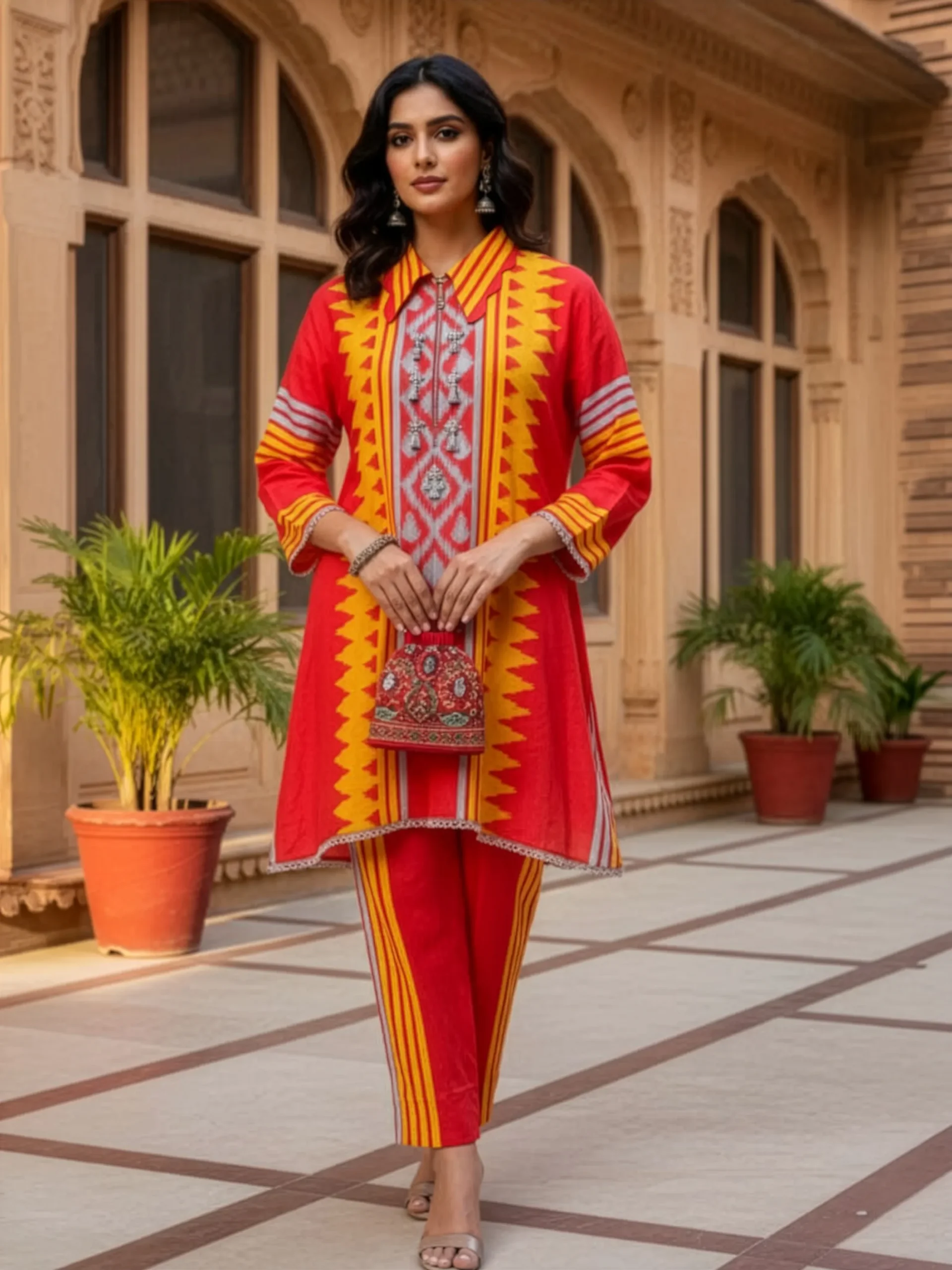A contemporary co-ord set featuring a structured collar neckline with a front zip and central embellishment, paired with straight pants for a sleek, modern ethnic look.