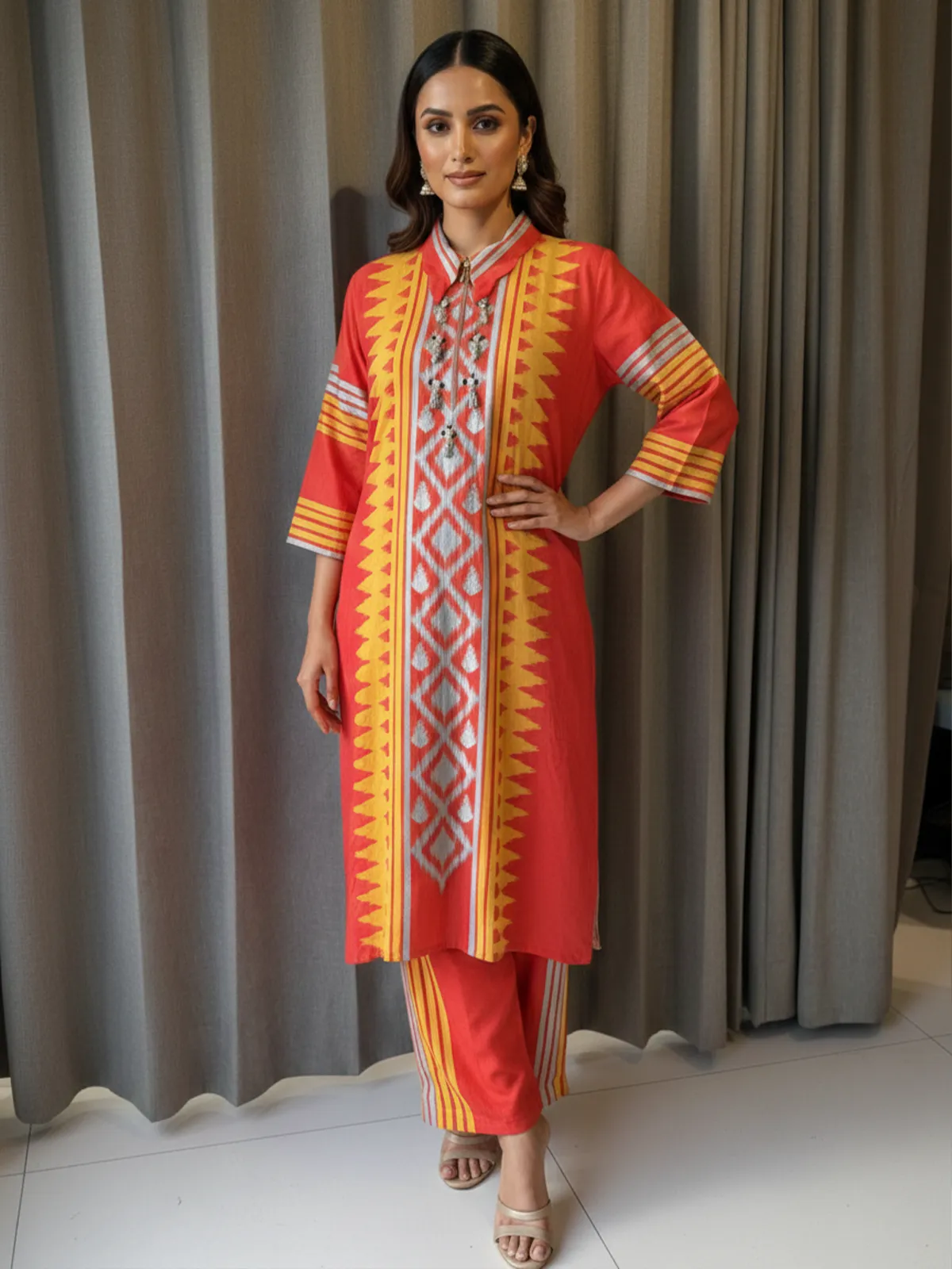 An A-line, calf-length kurta featuring a scalloped V-collar opening with zip closure and 3/4th sleeves, paired with straight-cut pants for an elegant contemporary silhouette.